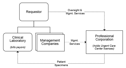 The opinion was requested by an MSO entity affiliated with four urgent care centers operated through management companies and one affiliated professional corporation. Due to state corporate practice of medicine prohibitions, the urgent care center licenses are held by the affiliated professional corporation. The MSO provides oversight and management services to the urgent care centers and holds ownership interests in the management companies associated with each urgent care center.